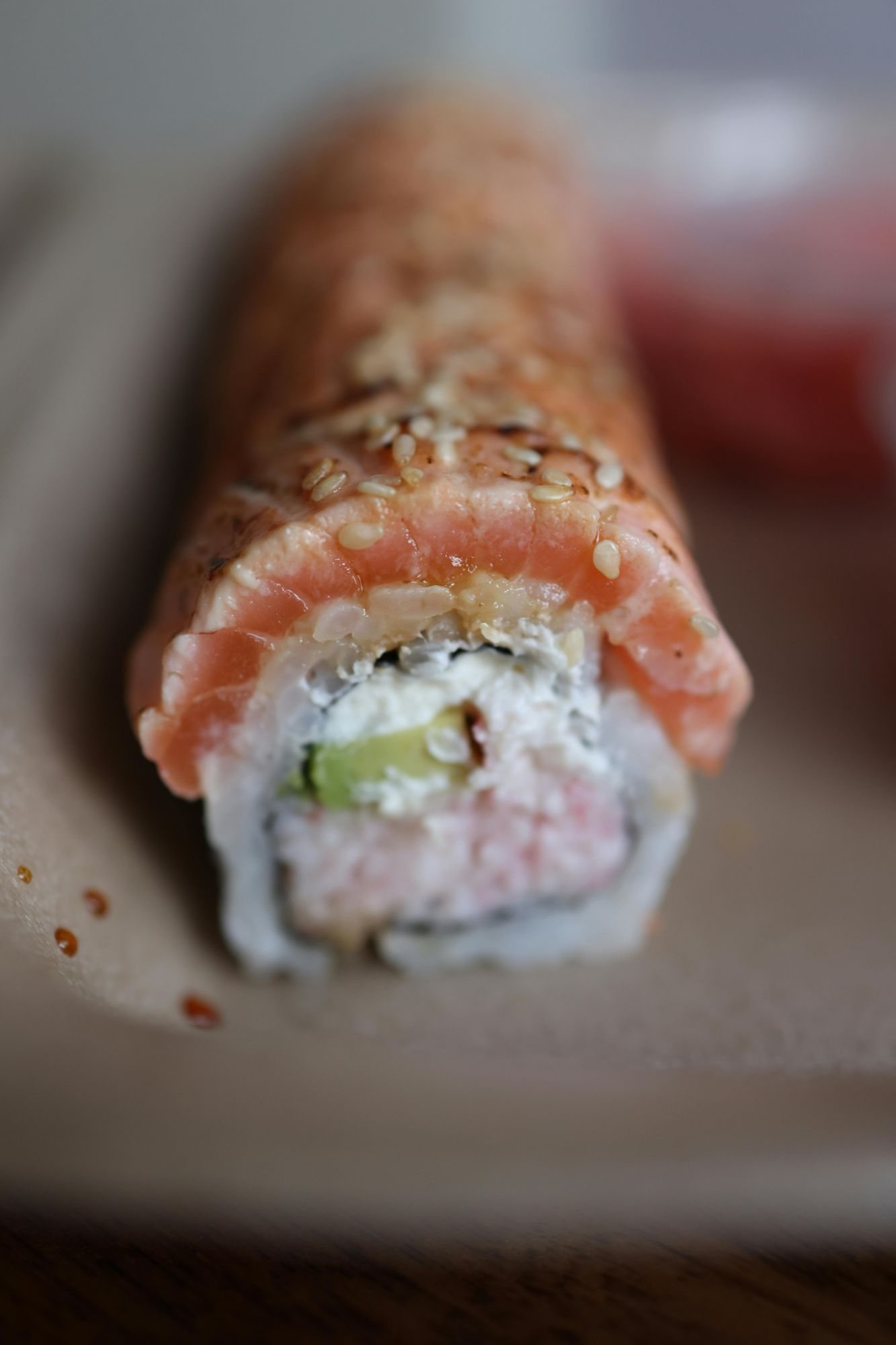 Futomaki z pieczonym łososiem, serkiem, awokado, kanpyo, ogórek, sałata, słodki sos, sezam 6 szt.