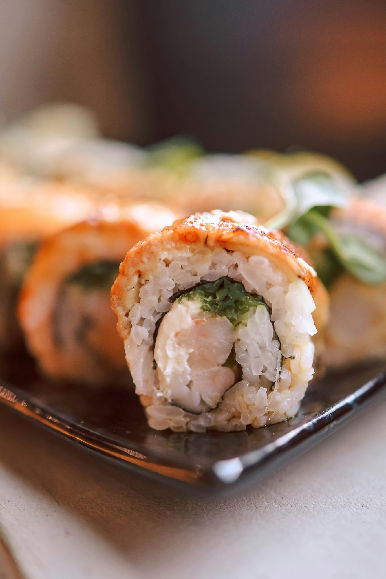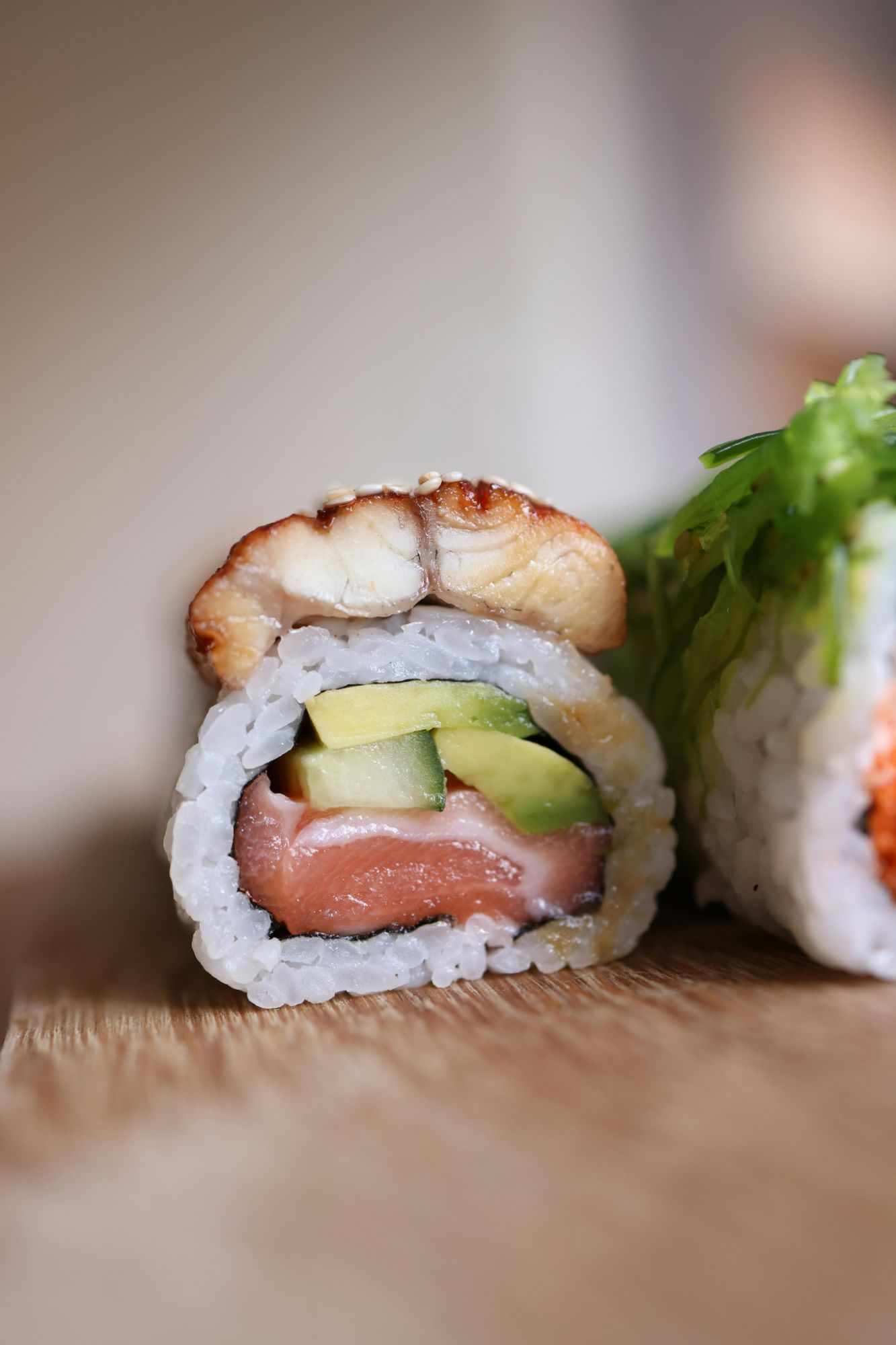 Surowa seriola, ryż, sałata, serek, awokado, ogórek, oshinko, kanpyo -